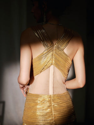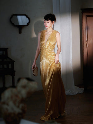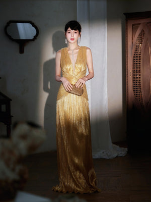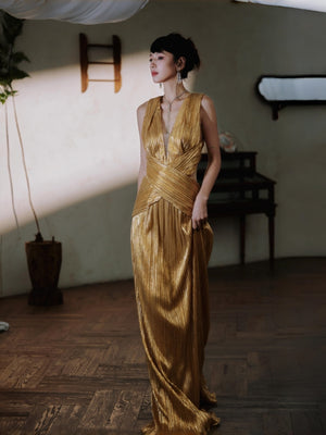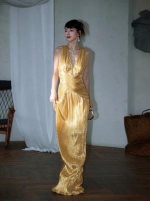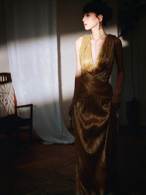 - Slit design, Metallic fabric with ruching detail at waist, Deep-V neckline, Maxi lenght
