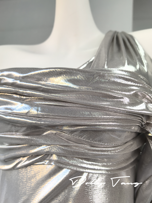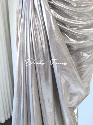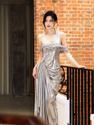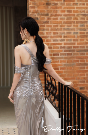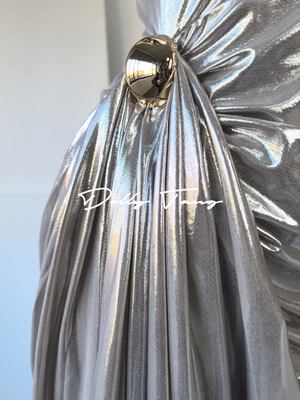 - Single shoulder design, irregular pleated details, slim-fit version cut, unique metallic fabric, Metal decoration.