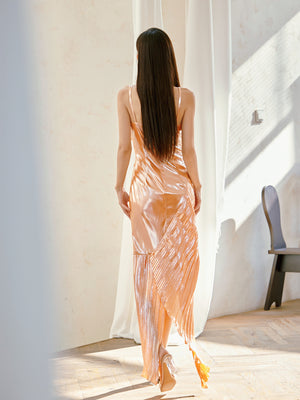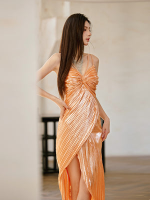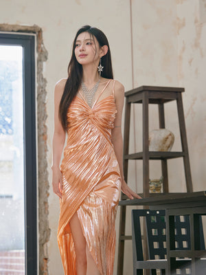 Dollytang Astrid Metallic Suspenders Gathered Warp Split Maxi Dress