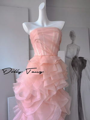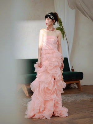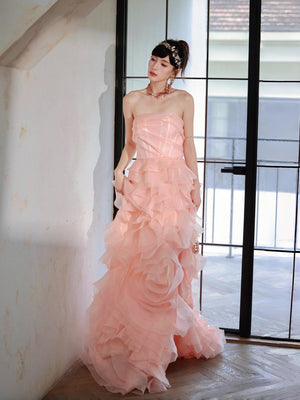- Trailing Train, Side Slit, Ruffled Flowers Design Cutting, Floor Length, Supported by fish bones, Flattering Fit.