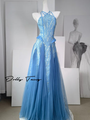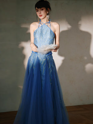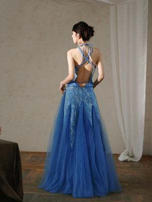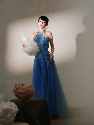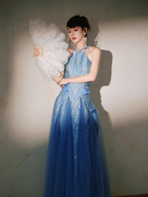 - Halter cross design, Sexy missing back details, Patchwork Gauze fabric, Full hemline.