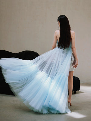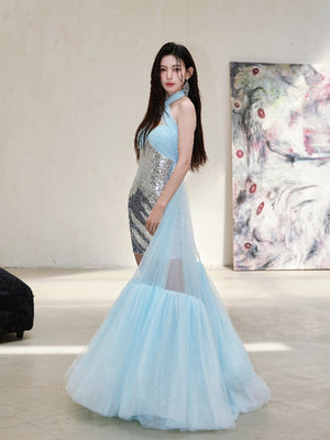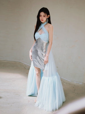 Dollytang Hazel Halterneck Sequin Patchwork Draped Mesh Mini Dress