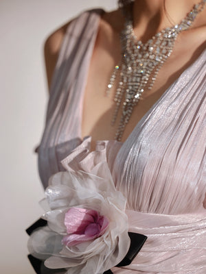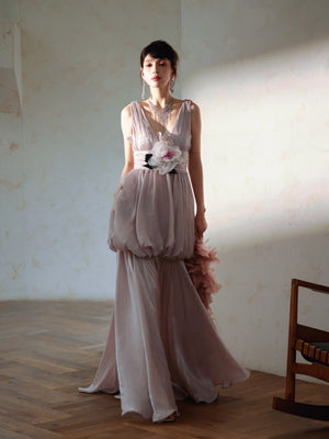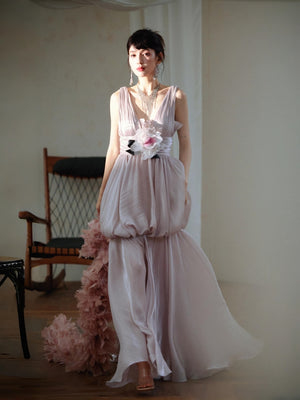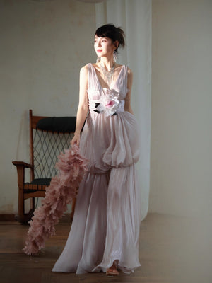 - Trailing train, Side slit, Flower decoration details, Ruffled jellyfish-silhouette, Floor length, Deep V neckline, Flattering fit, Flowy hemline.