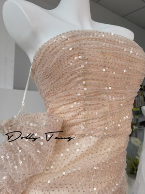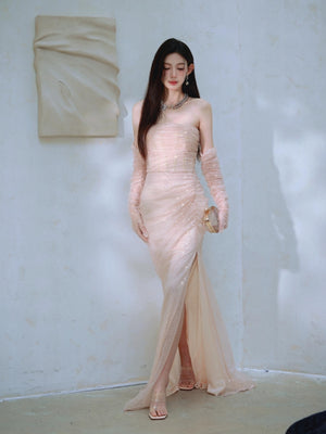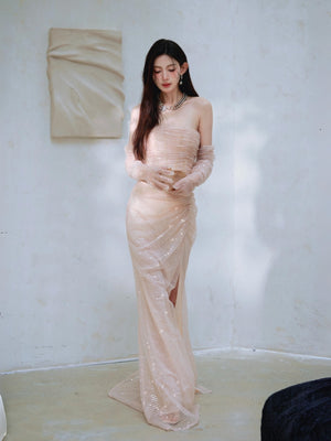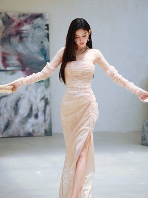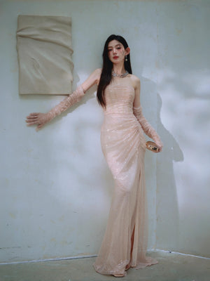 Dollytang Monet Strapless Sequin Mesh Maxi Dress With Gloves