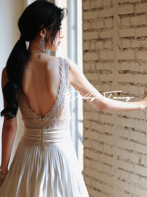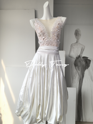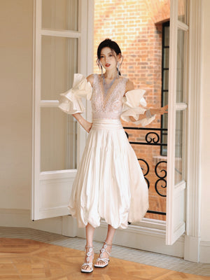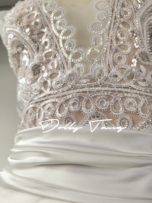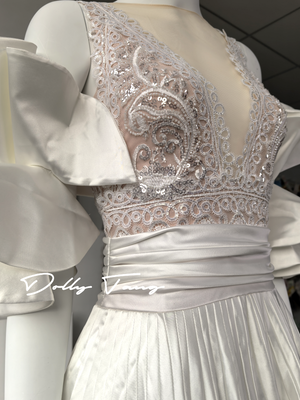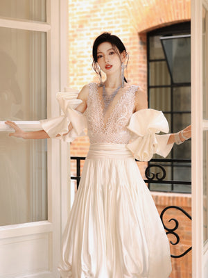 - Deep V and open back design, Heavy embroidery fabric splicing high luxury satin fabric, Elegant bud version, Sleeve removable, Slim-fit version.