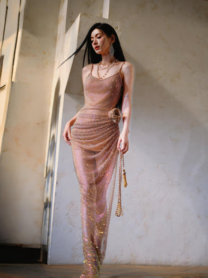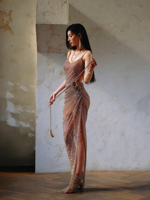 This stunning evening gown exudes romance and allure with its delicate 3D rose appliqués and sensual silhouette. Crafted from liquid-like sheer mesh fabric, the dress drapes fluidly over the body, creating a soft, ethereal effect that subtly reveals the skin beneath. Perfect for red carpets or romantic soirées, this dress merges botanical artistry with provocative sophistication.