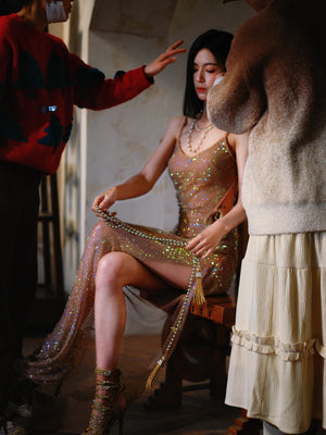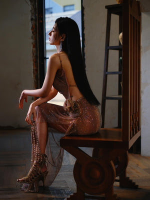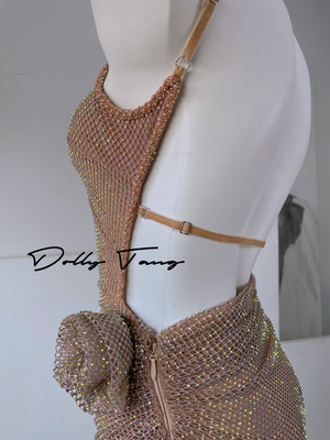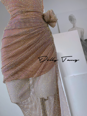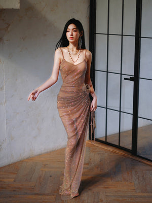 Dollytang Rozene Rhinestone Netted Split Maxi Dress