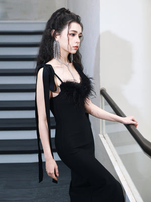 The dress is made from stretchy bandage fabric and features a halter neckline with feather detailing.
