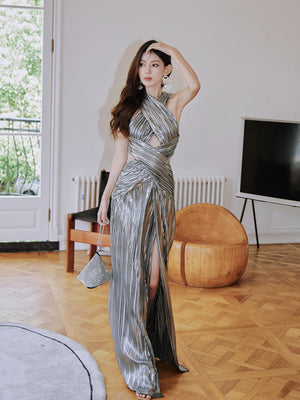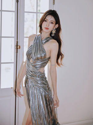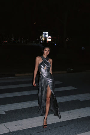 Dollytang Astrid Metallic Cut Out Gathered Warp Maxi Dress