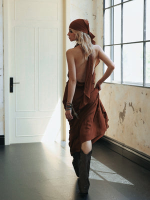 The Shieratt Artemisia Maxi Dress is your new go-to for effortlessly chic style. With a halter neck and backless design, this dress is both playful and sultry. The added ribbon detail ties the whole look together, making it perfect for any occasion. Embrace your inner fashionista with this must-have piece.