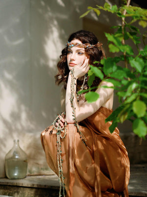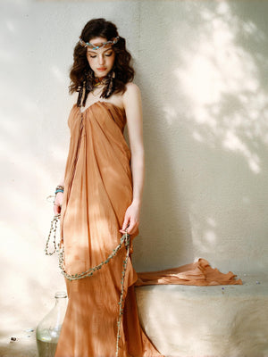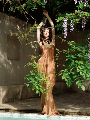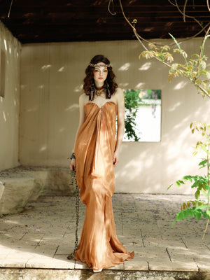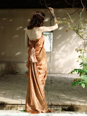 A masterpiece of elegance and movement—this strapless gown dazzles with liquid-like ruching that sculpts the silhouette, while delicate ribbons cascade in an ethereal dance. Designed to catch every light and every gaze.